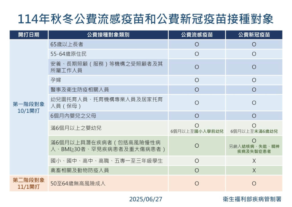 - 114/10/1起,調整COVID-19疫苗實施對象為9類對象 :65歲以上長者、55-64歲原住民、安養/長期照顧(服務)等機構受照顧者及其所屬工作人員、孕婦、滿6個月以上高風險對象、醫事及衛生防疫相關人員、幼兒園托育人員、托育機構專業人員及居家托育人員(保母)、6個月內嬰兒之父母、滿6個月以上至未滿6歲幼兒。